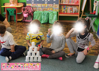 7. „Matematyczne szczyty”- zabawa matematyczno- konstrukcyjna/ puszki po czipsach; plastikowe kubeczki z napisanymi markerem działaniami; stoper; punkty./Pomysł na zabawę znalazłam TUTAJ